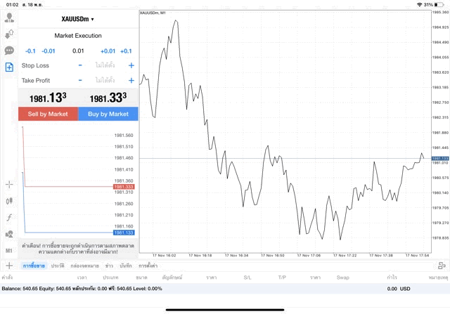 กรอกจำนวน lot แล้ว คลิ๊กปุ่ม Buy by market หรือ Sell by market เช่น 0.01 lot