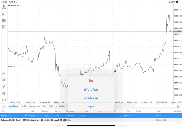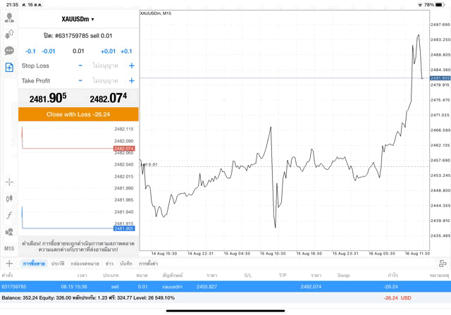 ขาดทุน ติดลบ -26.32$ ถ้าเปิดการเทรดครั้งนี้ไว้ต่อ ผลการลงทุนยังเปลี่ยนแปลงได้ อาจบวก อาจลบ บวกเพิ่ม ลบเพิ่ม