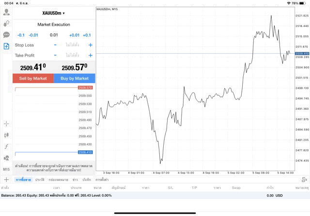 กรอกจำนวน lot แล้ว คลิ๊กปุ่ม Buy by market หรือ Sell by market เช่น 0.01 lot