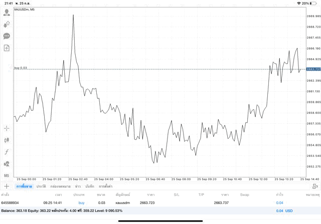 กรอกจำนวน lot แล้ว คลิ๊กปุ่ม Buy by market หรือ Sell by market เช่น 0.03 lot