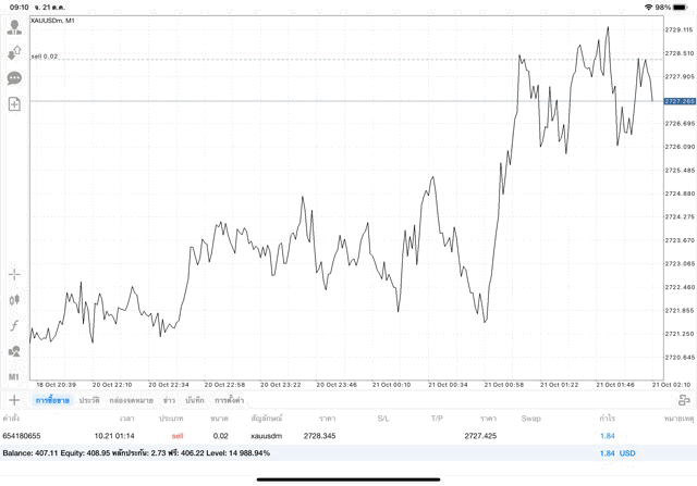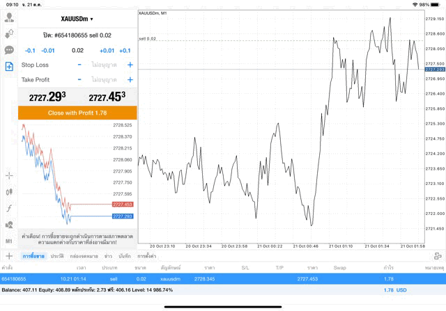 การเทรด XAUUSDm (ทองคำ) 0.02 lot แอพ Mt4