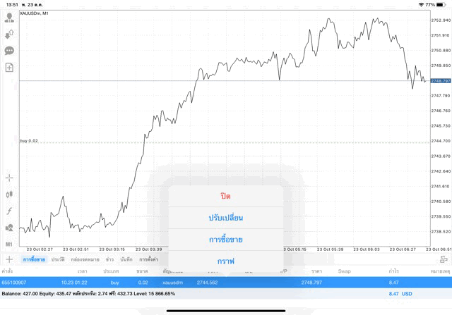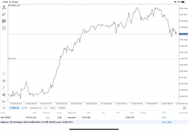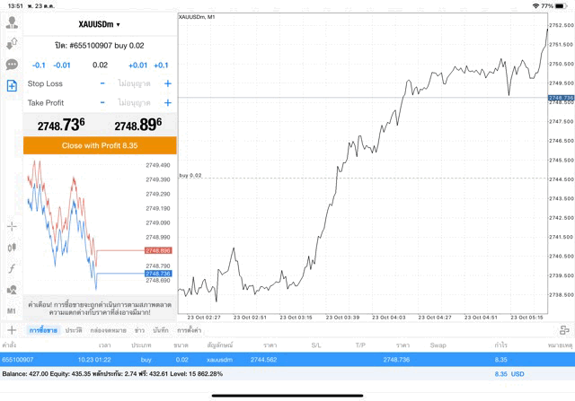 การเทรด XAUUSDm (ทองคำ) 0.02 lot แอพ Mt4