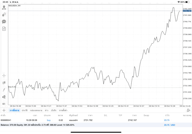 เวลาผ่านไป ผลการลงทุน +20.75$ ถ้าเปิดการเทรดครั้งนี้ไว้ต่อ ผลการลงทุนยังเปลี่ยนแปลงได้ อาจบวก อาจลบ บวกเพิ่ม ลบเพิ่ม
