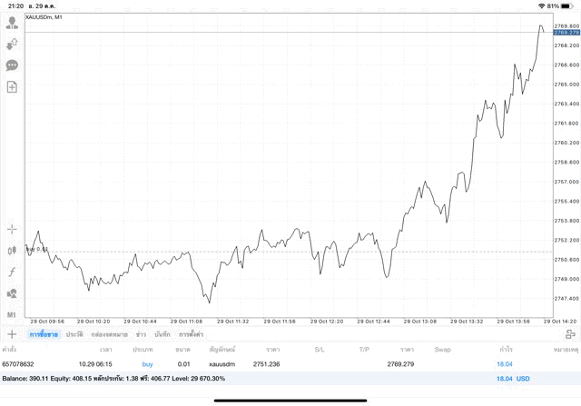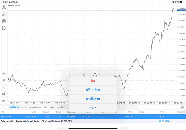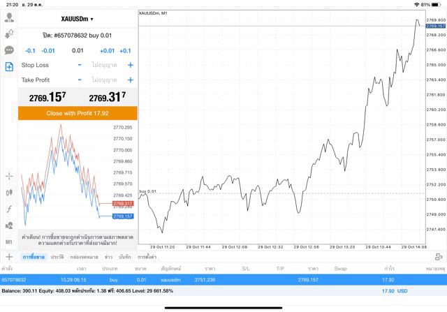 การเทรด XAUUSDm (ทองคำ) 0.01 lot แอพ Mt4