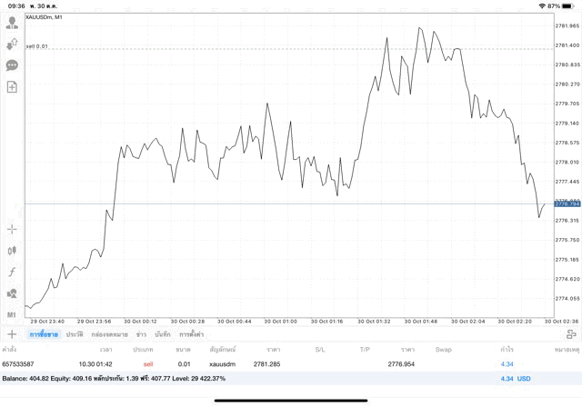เวลาผ่านไป ผลการลงทุน +4.34$ ถ้าเปิดการเทรดครั้งนี้ไว้ต่อ ผลการลงทุนยังเปลี่ยนแปลงได้ อาจบวก อาจลบ บวกเพิ่ม ลบเพิ่ม