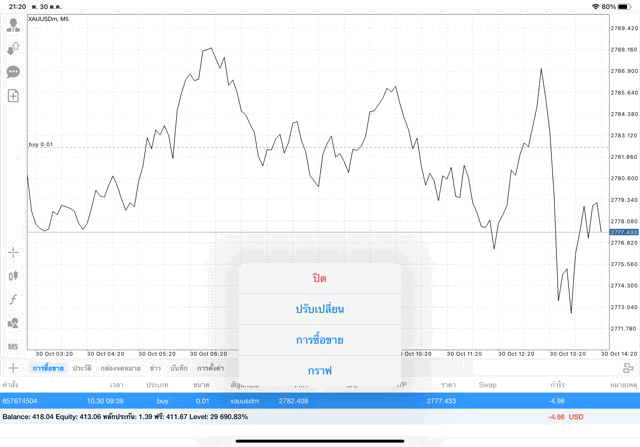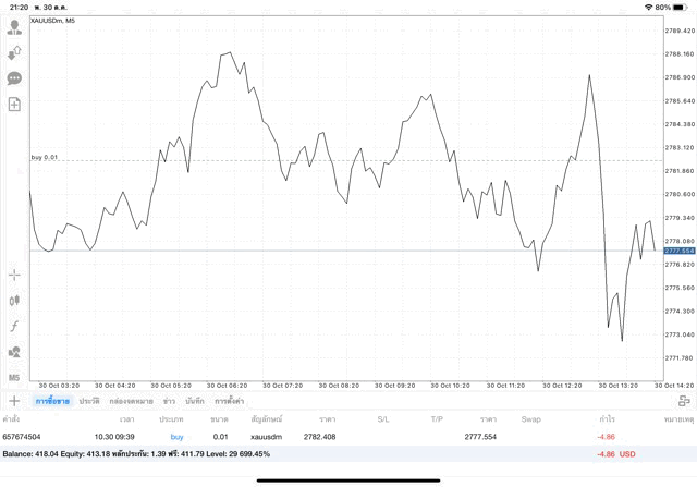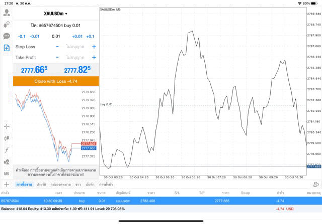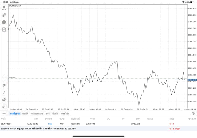 การเทรด XAUUSDm (ทองคำ) 0.01 lot แอพ Mt4