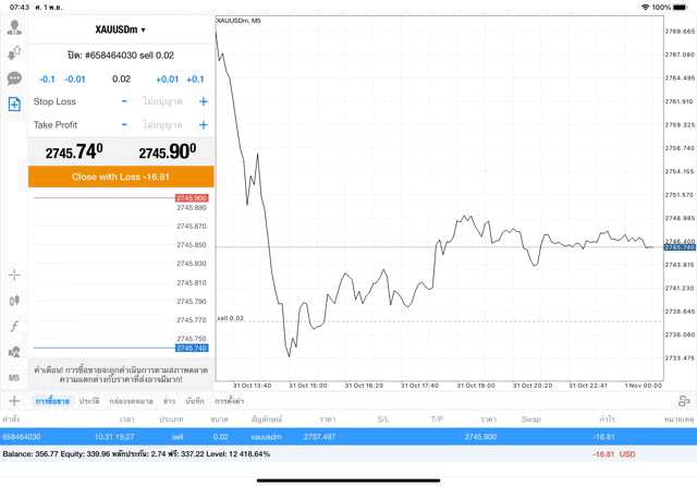 การเทรด XAUUSDm (ทองคำ) 0.02 lot แอพ Mt4