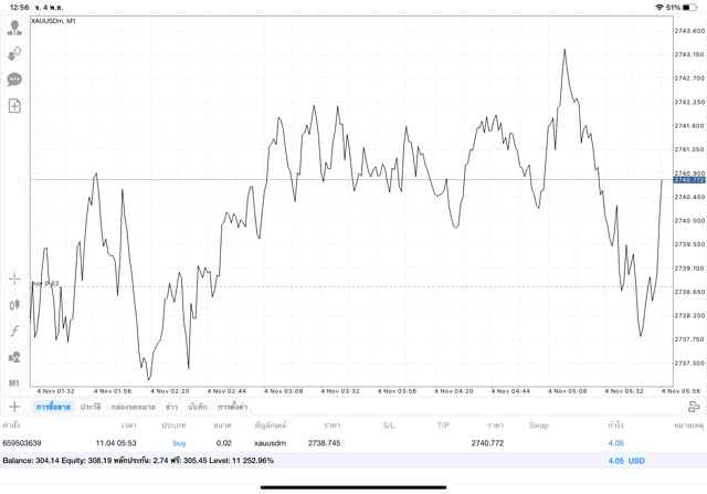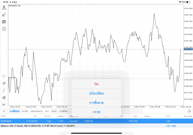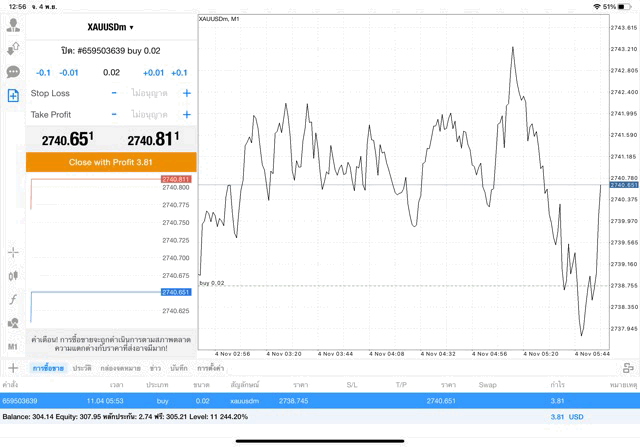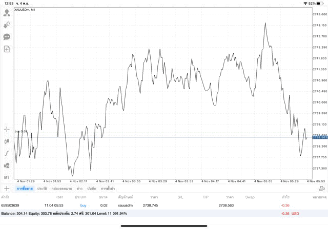 การเทรด XAUUSDm (ทองคำ) 0.02 lot แอพ Mt4
