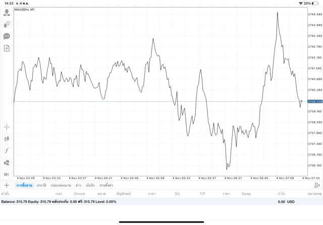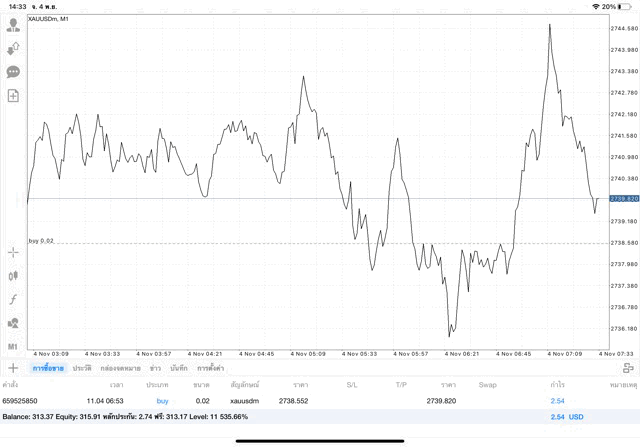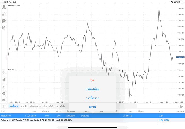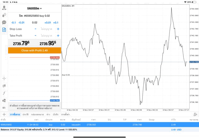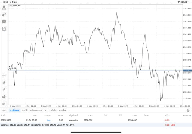 การเทรด XAUUSDm (ทองคำ) 0.02 lot แอพ Mt4