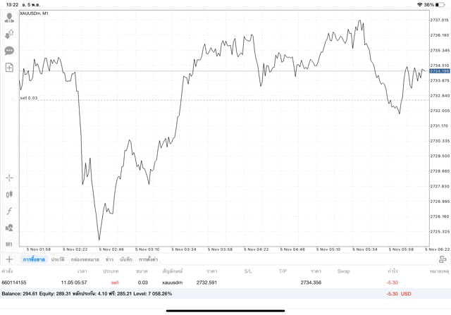 เวลาผ่านไป ผลการลงทุน -5.30$ ถ้าเปิดการเทรดครั้งนี้ไว้ต่อ ผลการลงทุนยังเปลี่ยนแปลงได้ อาจบวก อาจลบ บวกเพิ่ม ลบเพิ่ม
