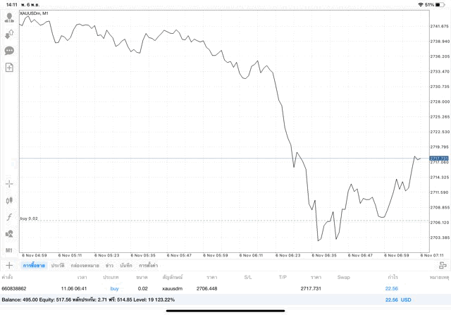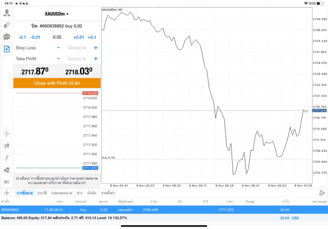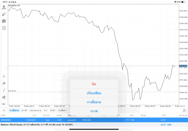 การเทรด XAUUSDm (ทองคำ) 0.02 lot แอพ Mt4