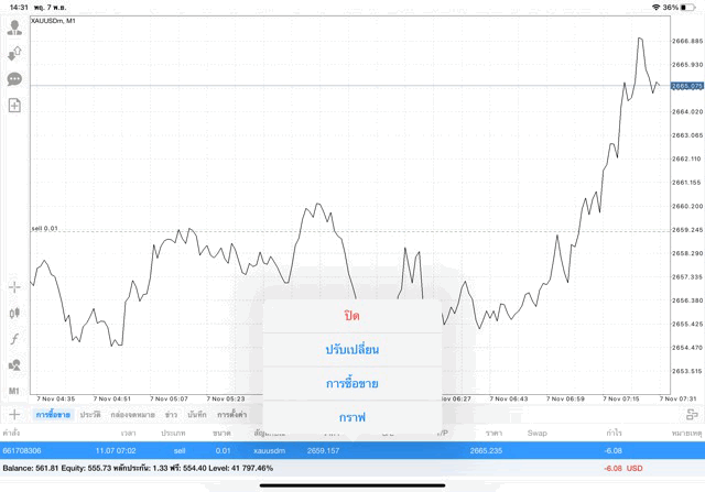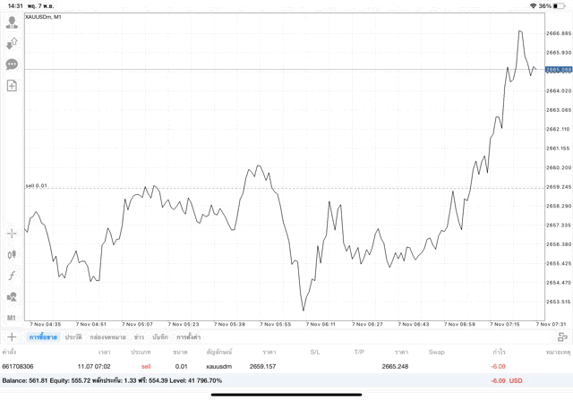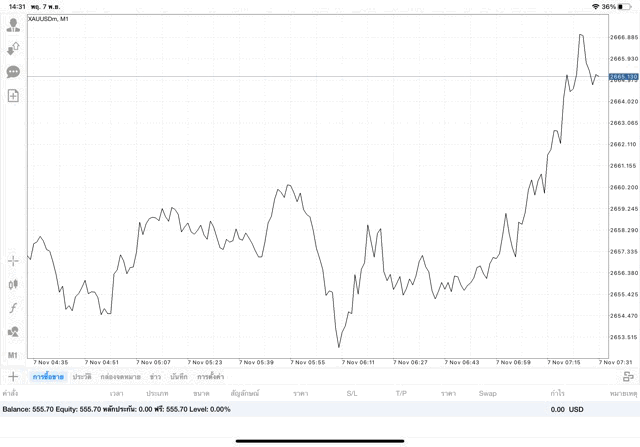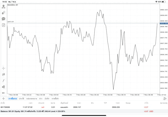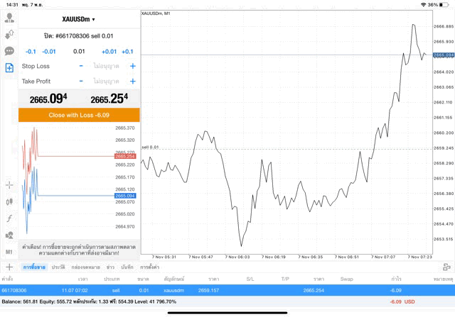 การเทรด XAUUSDm (ทองคำ) 0.01 lot แอพ Mt4