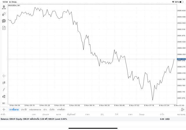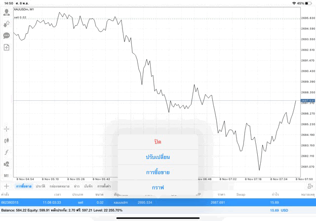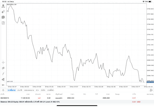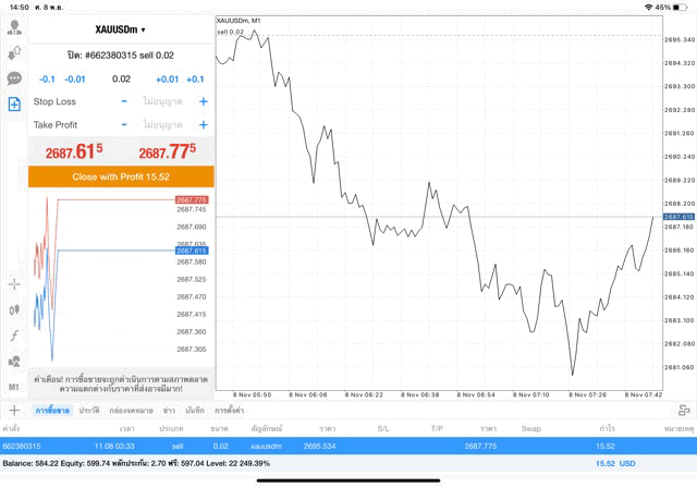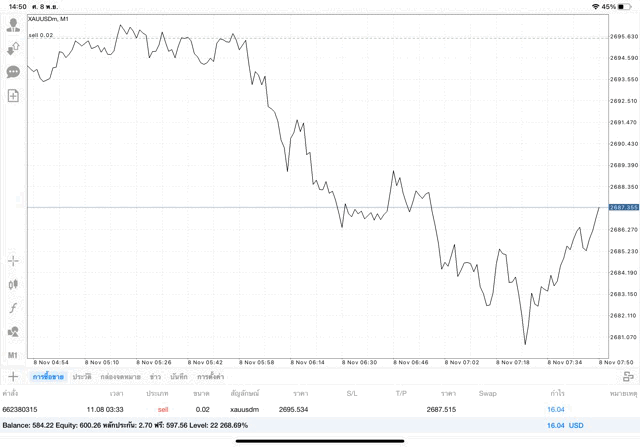 การเทรด XAUUSDm (ทองคำ) 0.02 lot แอพ Mt4