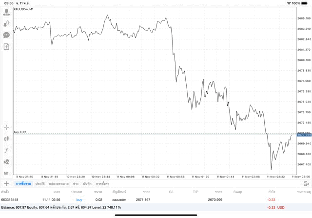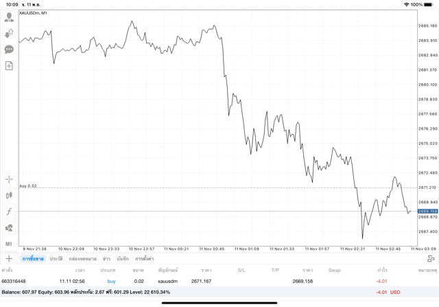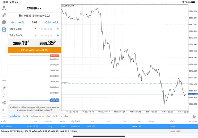 การเทรด XAUUSDm (ทองคำ) 0.02 lot แอพ Mt4
