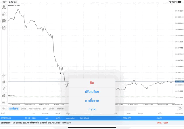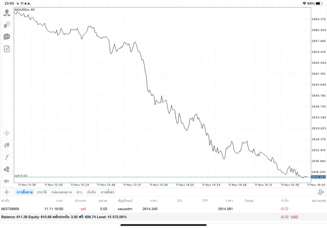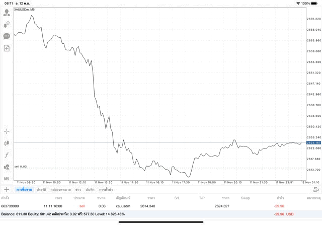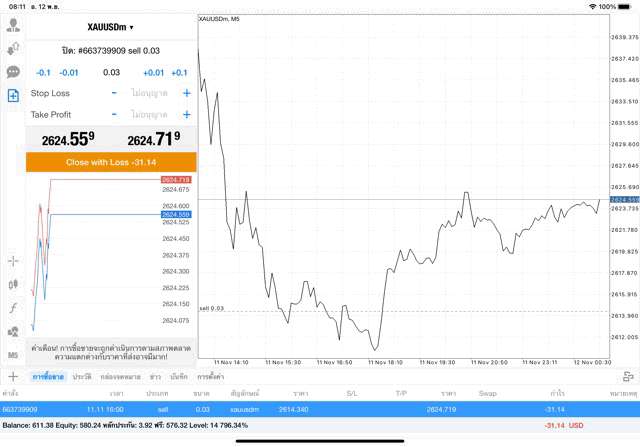 การเทรด XAUUSDm (ทองคำ) 0.03 lot แอพ Mt4