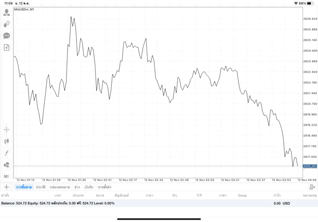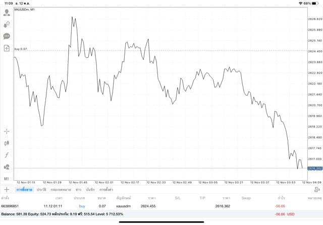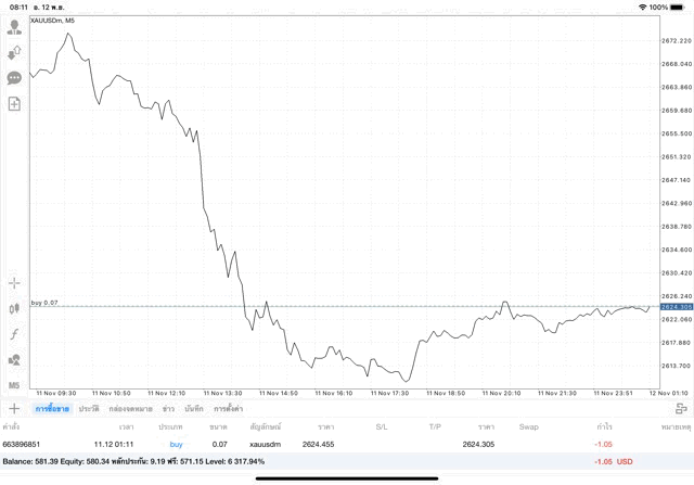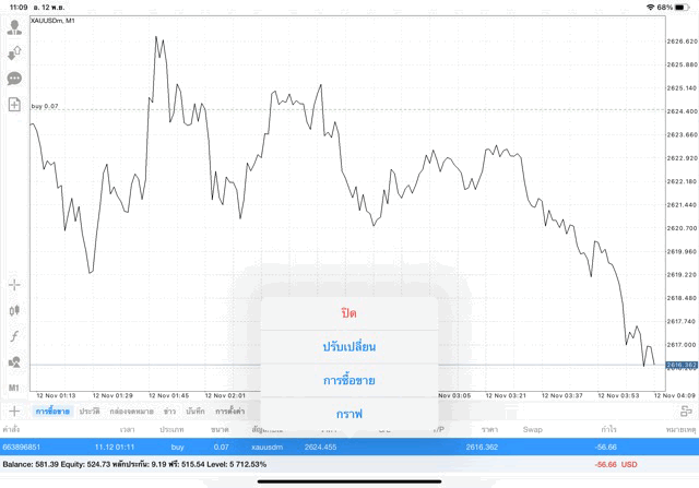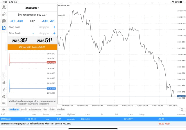 การเทรด XAUUSDm (ทองคำ) 0.07 lot แอพ Mt4