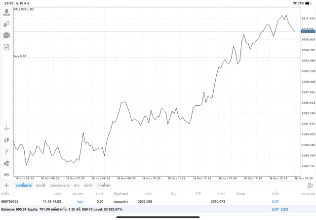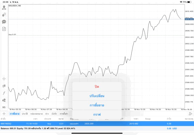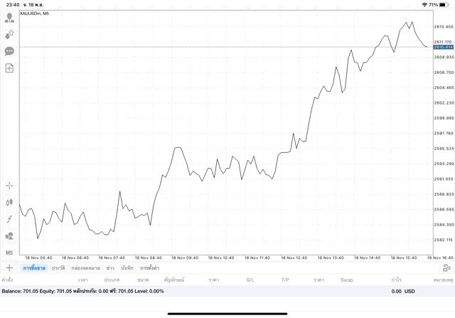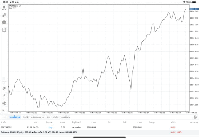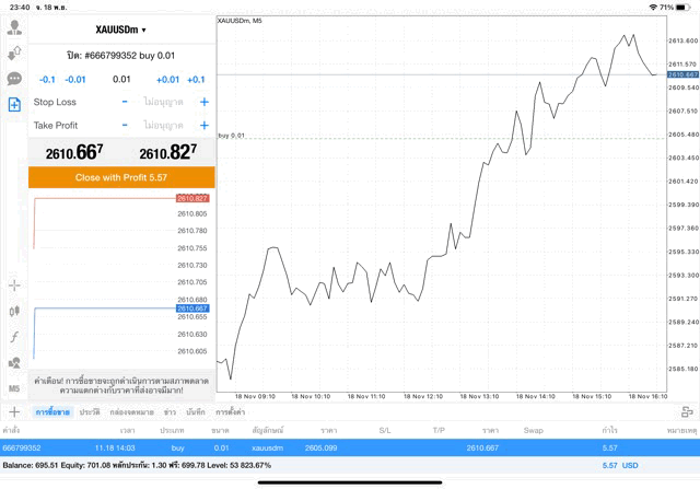 การเทรด XAUUSDm (ทองคำ) 0.01 lot แอพ Mt4