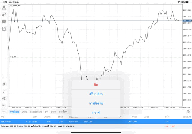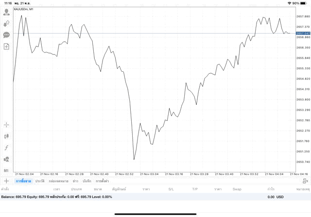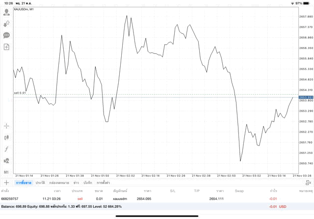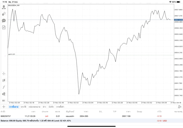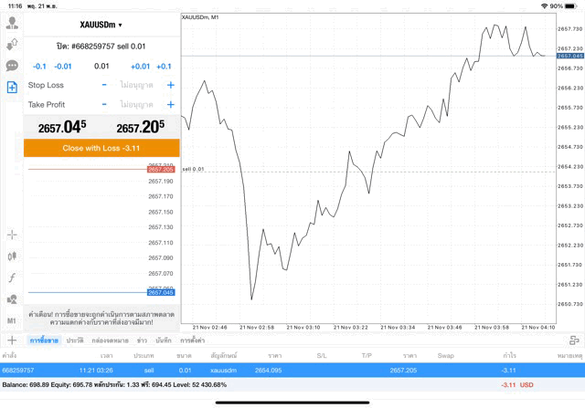 การเทรด XAUUSDm (ทองคำ) 0.01 lot แอพ Mt4