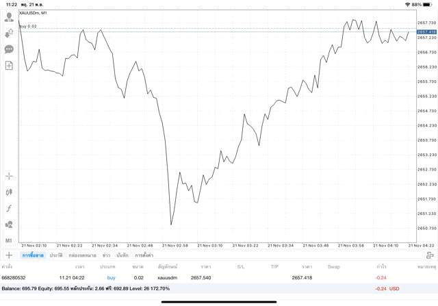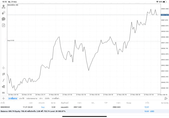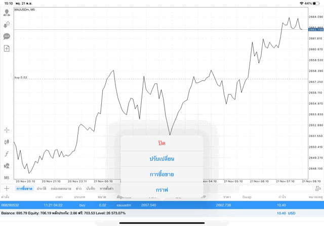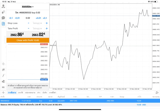 การเทรด XAUUSDm (ทองคำ) 0.02 lot แอพ Mt4