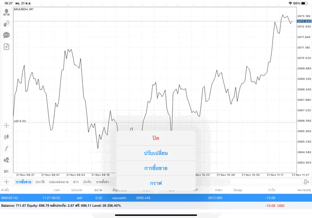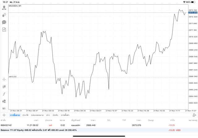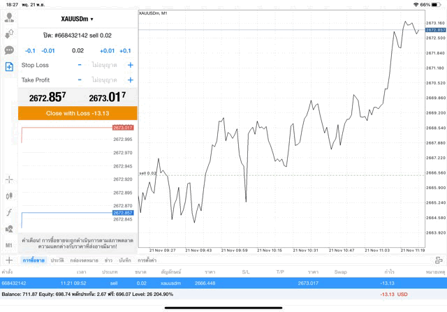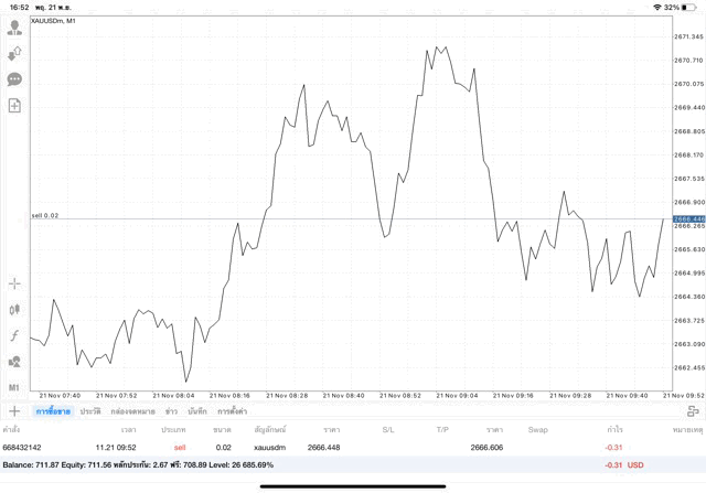 การเทรด XAUUSDm (ทองคำ) 0.02 lot แอพ Mt4