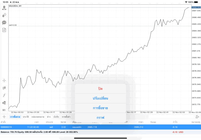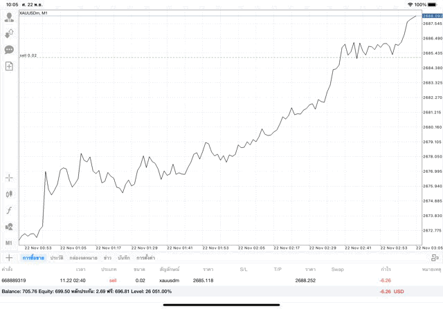 ติดลบก่อนนะ เมื่อเวลาผ่านไป ผลการลงทุนอาจจะกลับไปบวก หรือ อาจติดลบเพิ่มขึ้น อาจได้กำไร มาก น้อย หรือ ขาดทุน มาก น้อย XAUUSDm หมายถึง ทองคำ (XAU) แลกเปลี่ยน เงินดอลลาร์อเมริกา (USD)