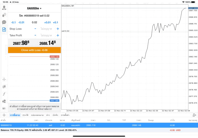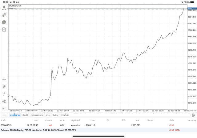 การเทรด XAUUSDm (ทองคำ) 0.02 lot แอพ Mt4