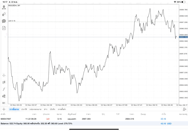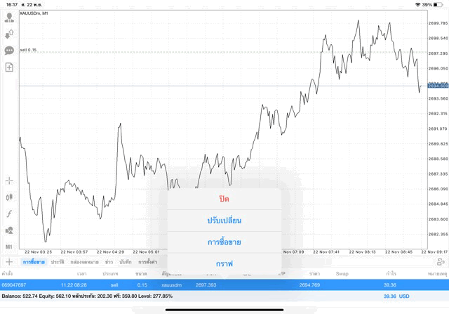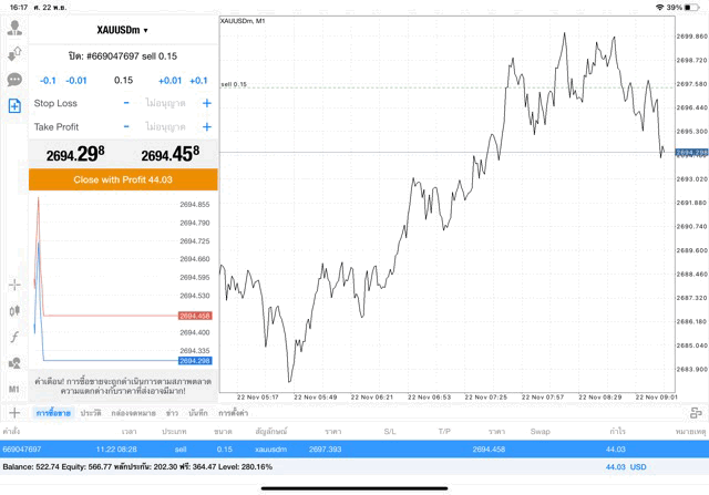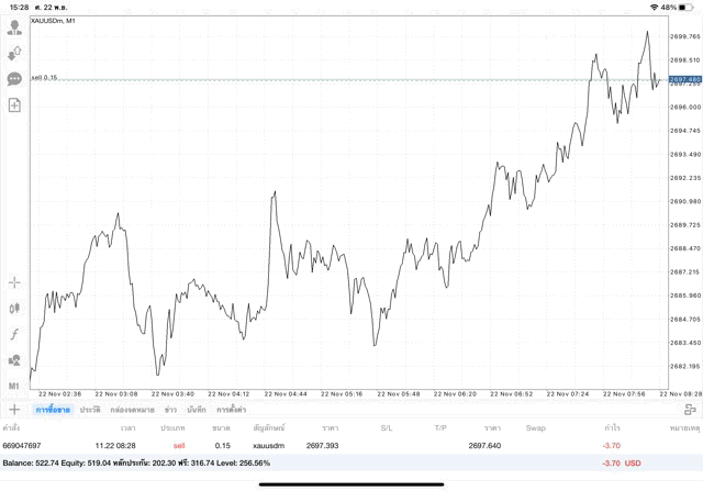 การเทรด XAUUSDm (ทองคำ) 0.15 lot แอพ Mt4
