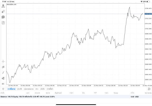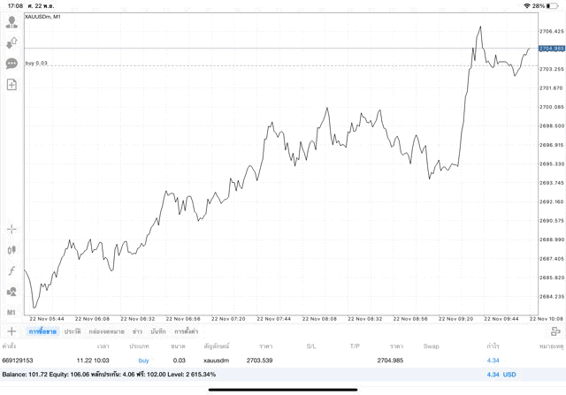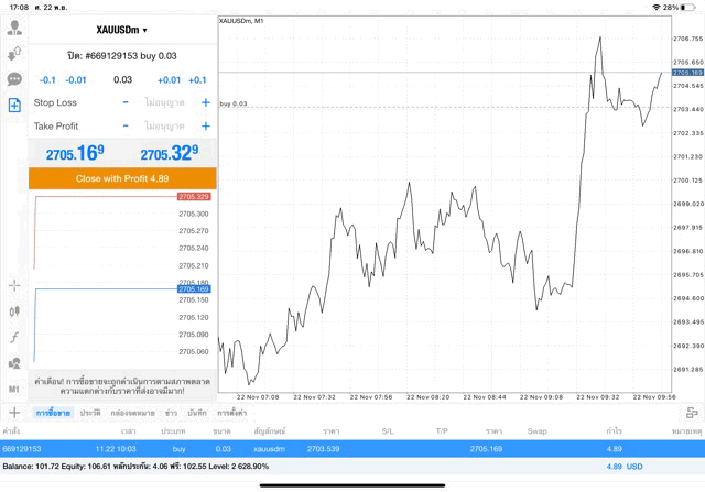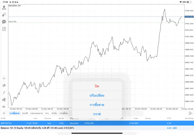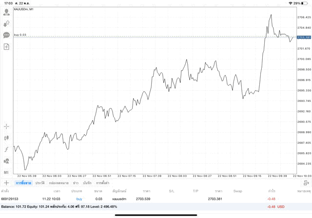 การเทรด XAUUSDm (ทองคำ) 0.03 lot แอพ Mt4
