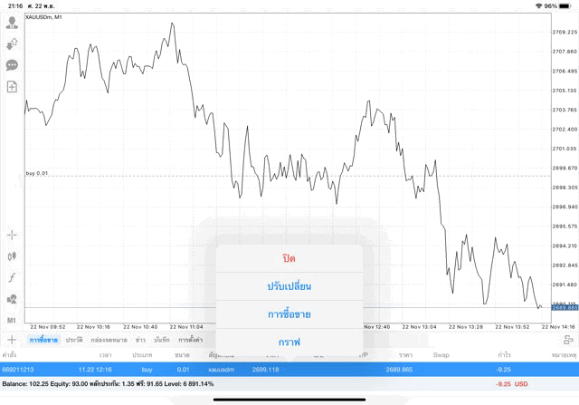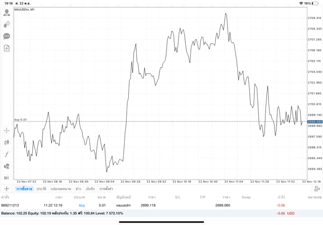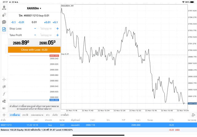 การเทรด XAUUSDm (ทองคำ) 0.01 lot แอพ Mt4