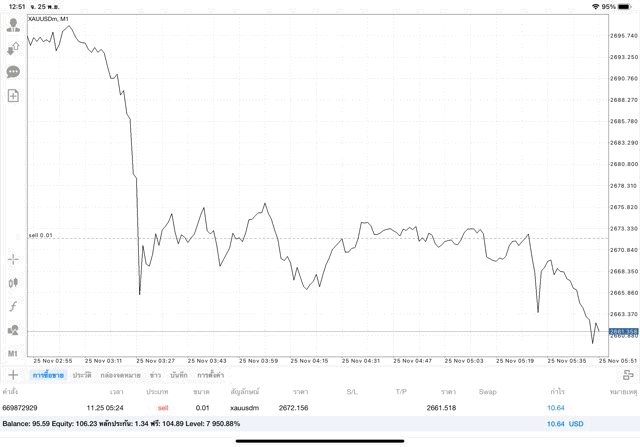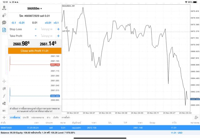 การเทรด XAUUSDm (ทองคำ) 0.01 lot แอพ Mt4