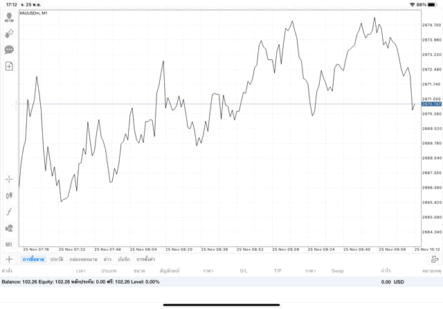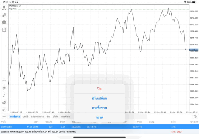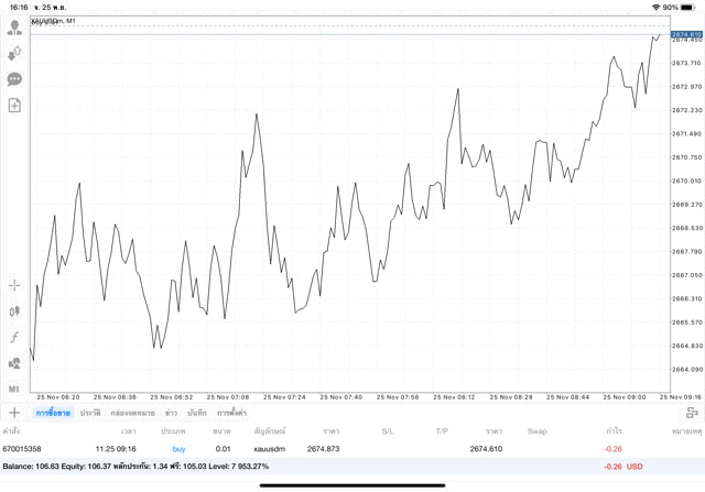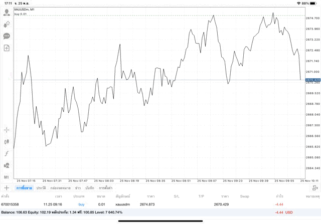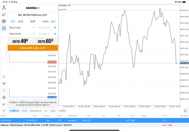 การเทรด XAUUSDm (ทองคำ) 0.01 lot แอพ Mt4