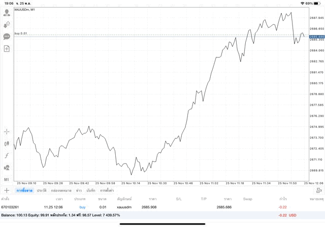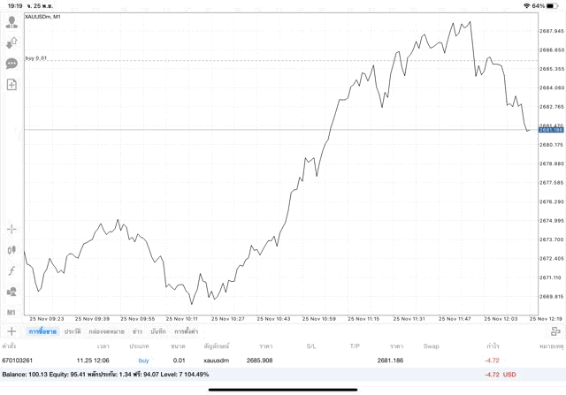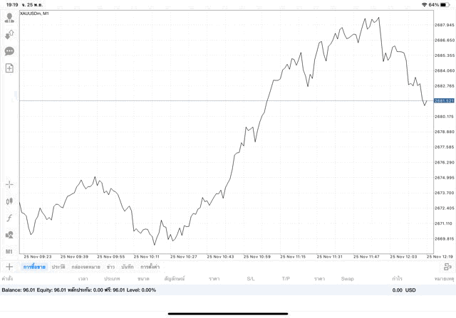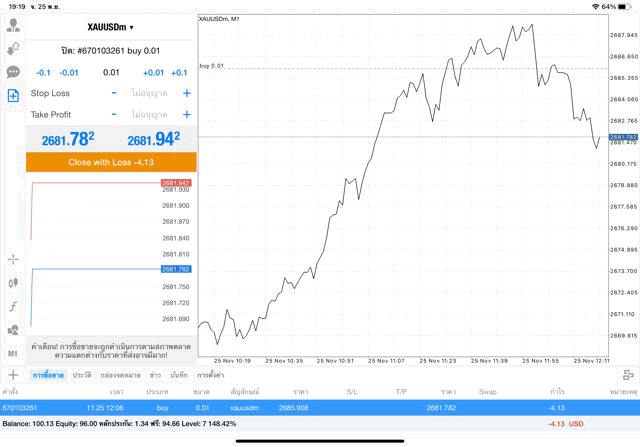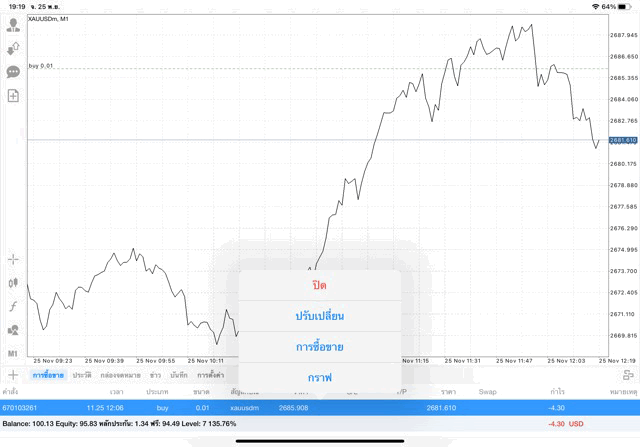 การเทรด XAUUSDm (ทองคำ) 0.01 lot แอพ Mt4