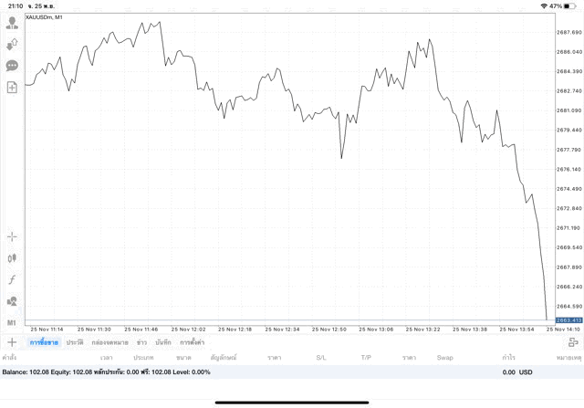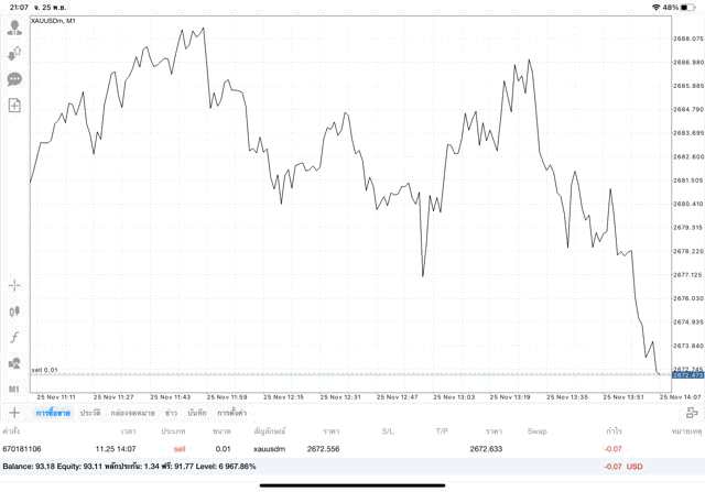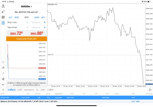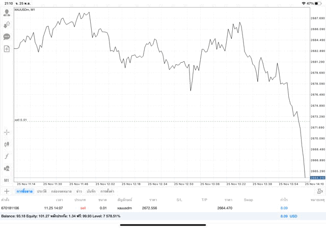 การเทรด XAUUSDm (ทองคำ) 0.01 lot แอพ Mt4