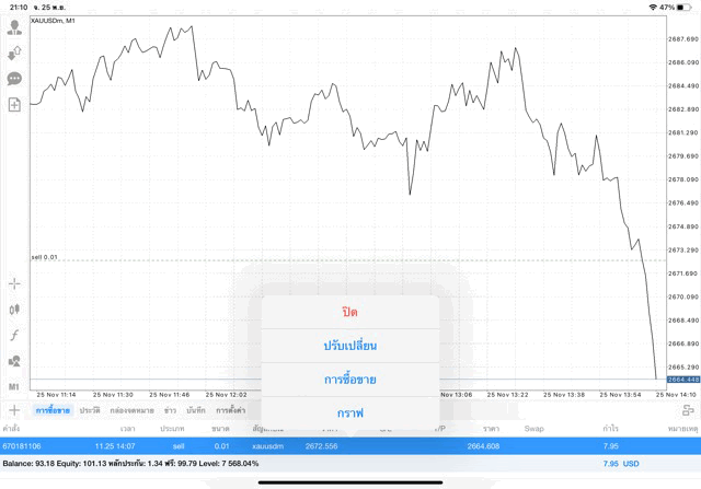 ติดลบก่อนนะ เมื่อเวลาผ่านไป ผลการลงทุนอาจจะกลับไปบวก หรือ อาจติดลบเพิ่มขึ้น อาจได้กำไร มาก น้อย หรือ ขาดทุน มาก น้อย XAUUSDm หมายถึง ทองคำ (XAU) แลกเปลี่ยน เงินดอลลาร์อเมริกา (USD)