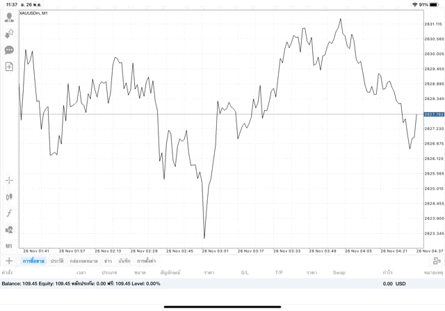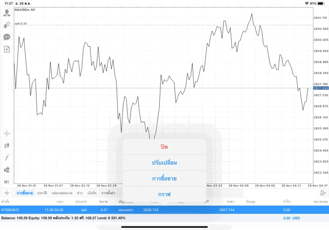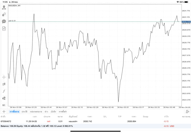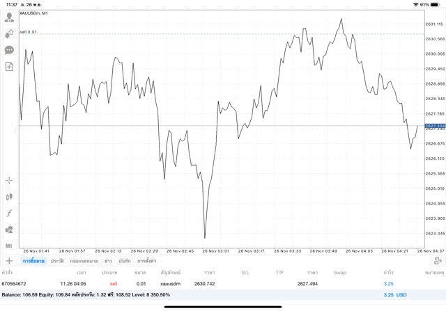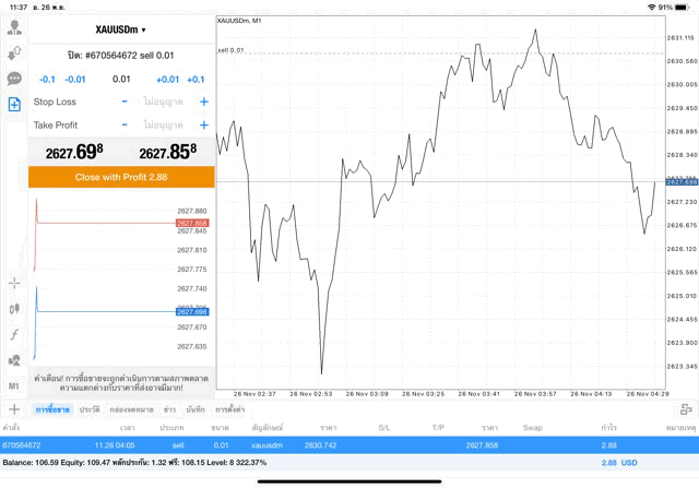 การเทรด XAUUSDm (ทองคำ) 0.01 lot แอพ Mt4