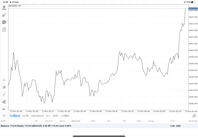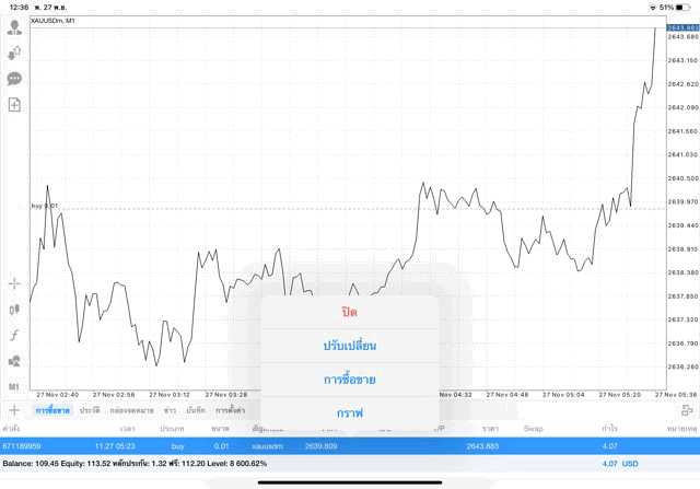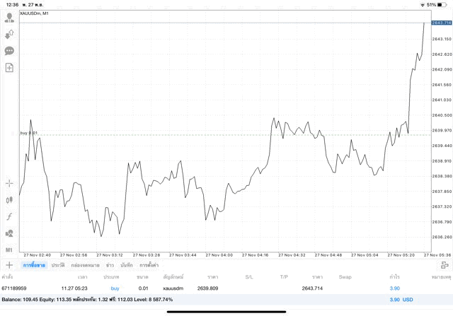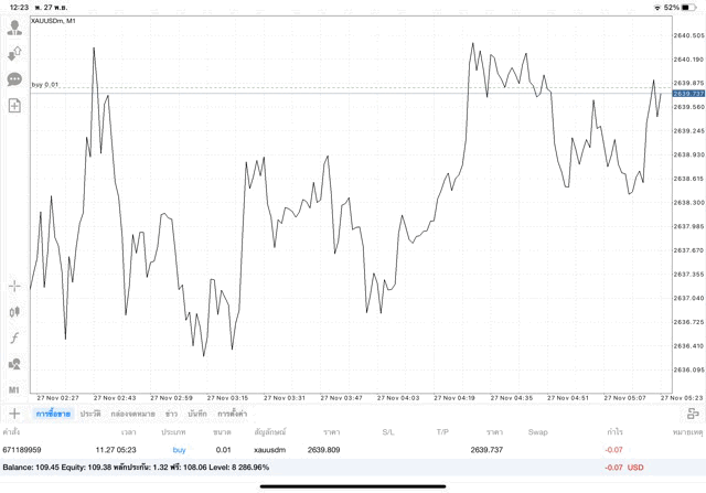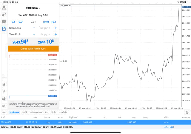การเทรด XAUUSDm (ทองคำ) 0.01 lot แอพ Mt4