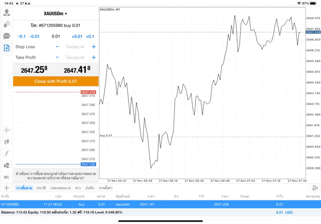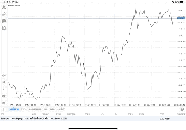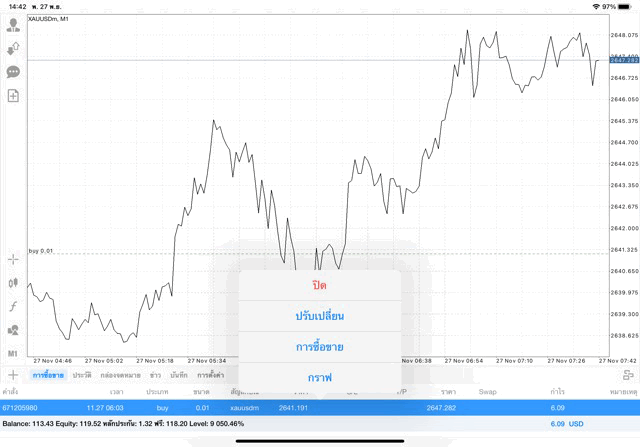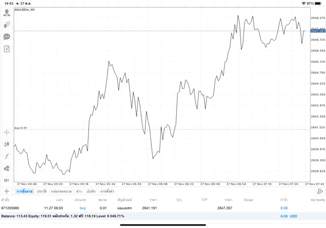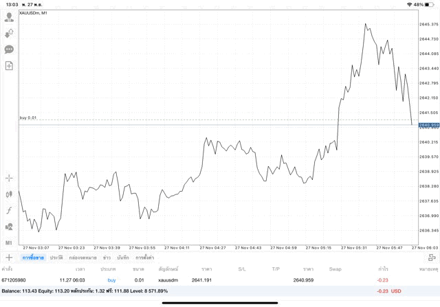 การเทรด XAUUSDm (ทองคำ) 0.01 lot แอพ Mt4