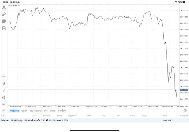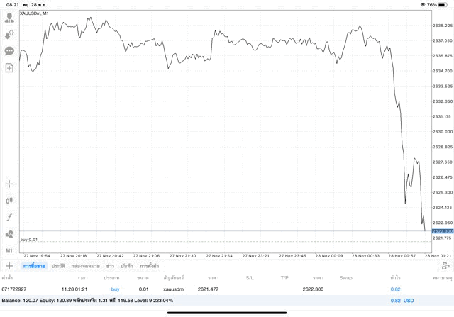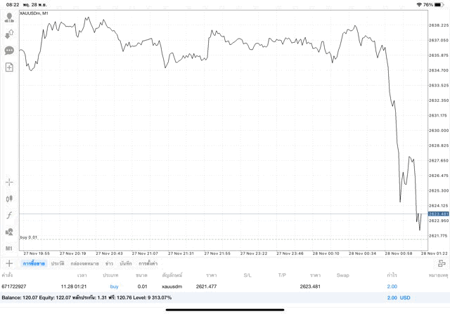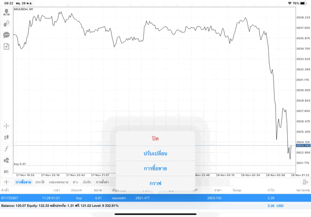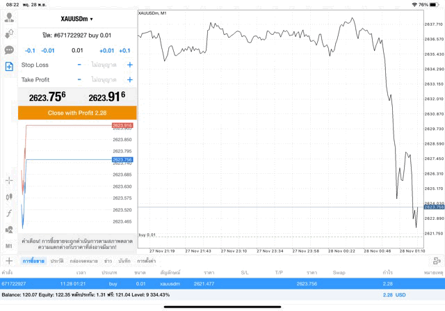 การเทรด XAUUSDm (ทองคำ) 0.01 lot แอพ Mt4