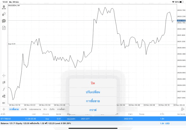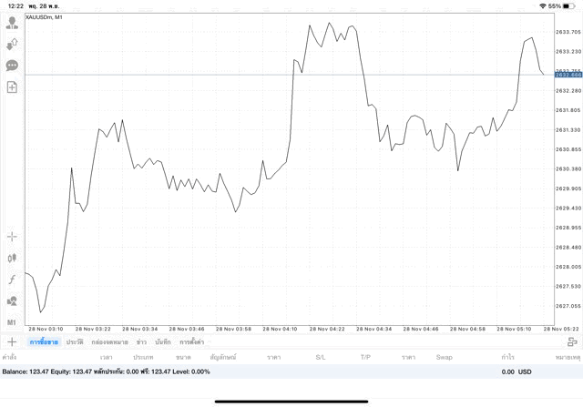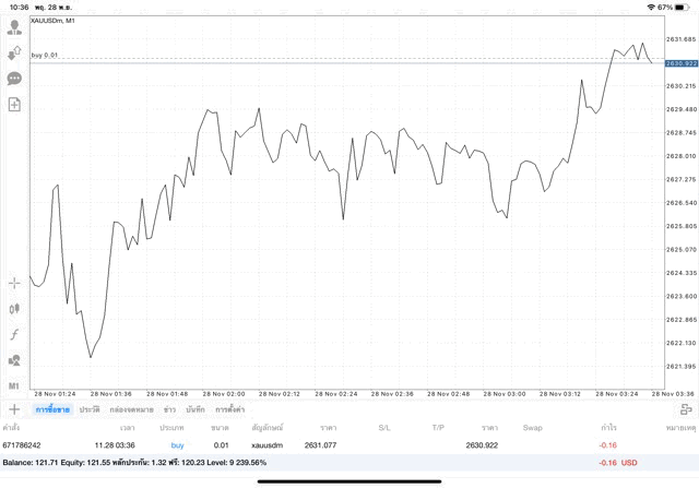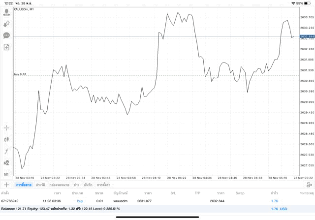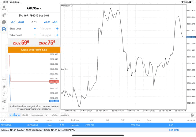 การเทรด XAUUSDm (ทองคำ) 0.01 lot แอพ Mt4
