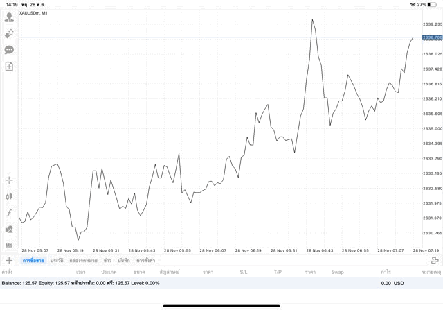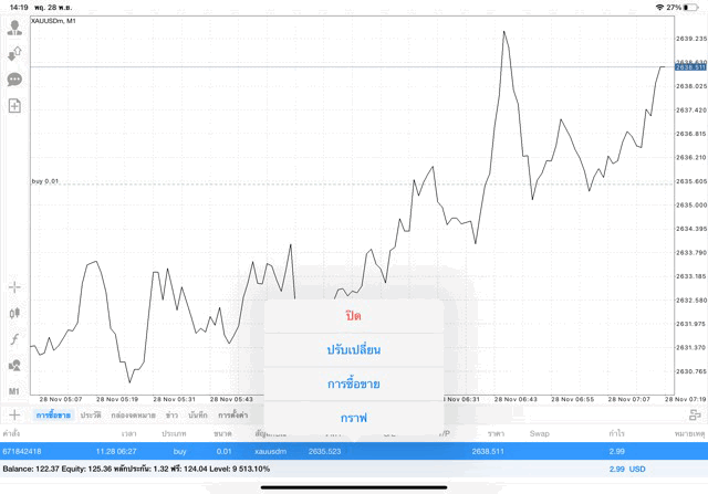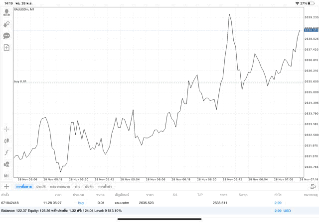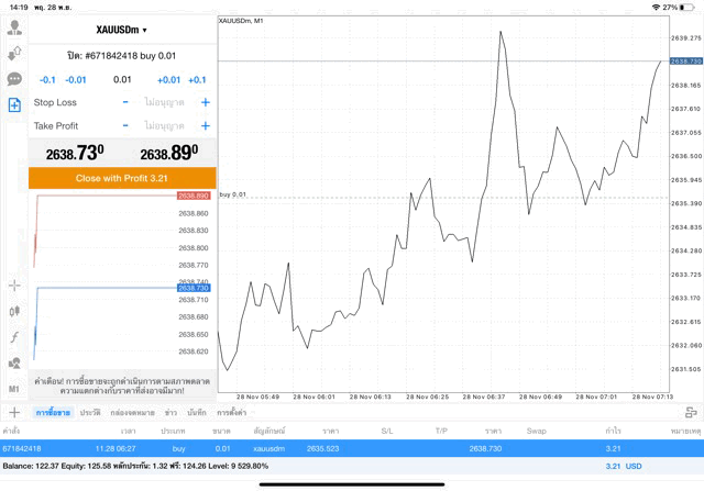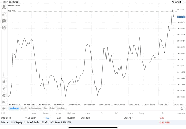 การเทรด XAUUSDm (ทองคำ) 0.01 lot แอพ Mt4