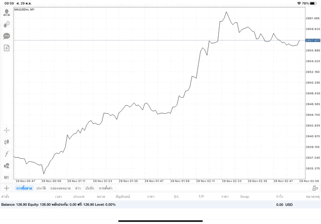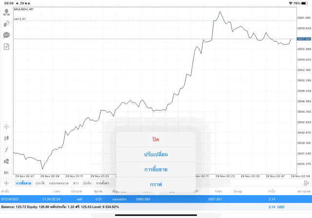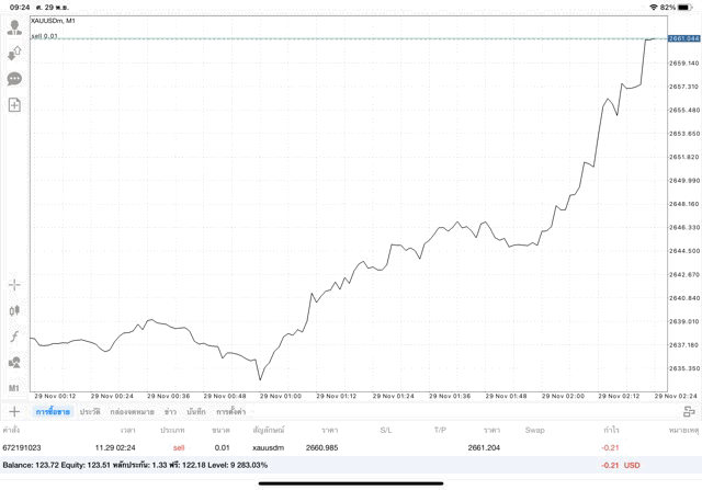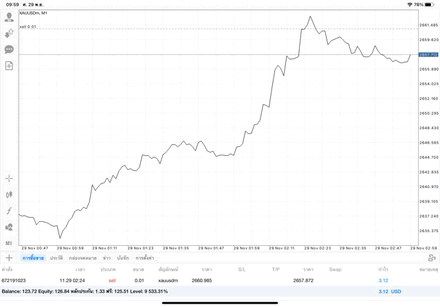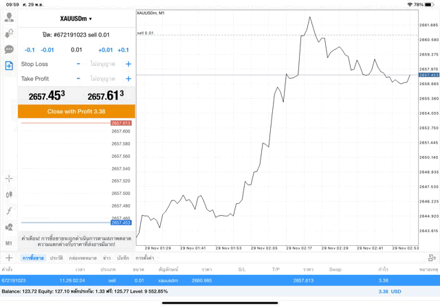 การเทรด XAUUSDm (ทองคำ) 0.01 lot แอพ Mt4