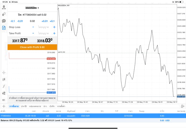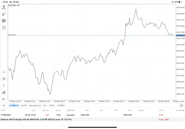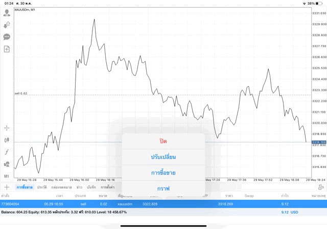 การเทรด XAUUSDm (ทองคำ) 0.02 lot แอพ Mt4