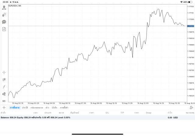 คลิ๊กค้างบน EURUSD ที่เพิ่มมาบนหน้าแรก แล้วเลือก กราฟ เปิดกราฟราคา EURUSD วิเคราะห์ราคา แล้วคลิ๊กปุ่ม + บนแผงเมนูด้านข้าง เปิดหน้าต่างส่งคำสั่งซื้อขาย