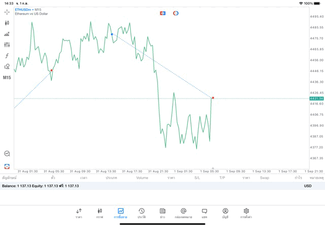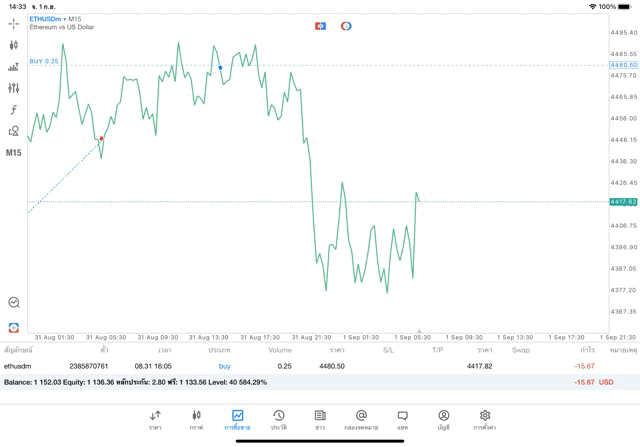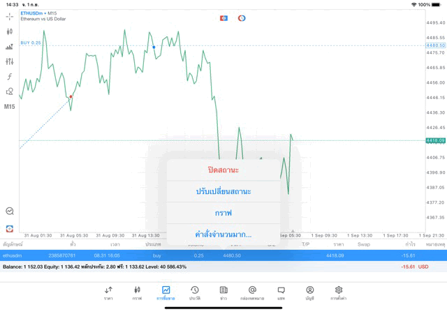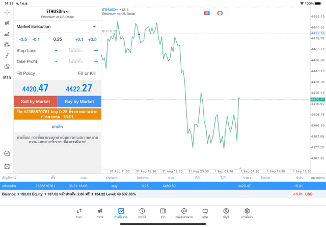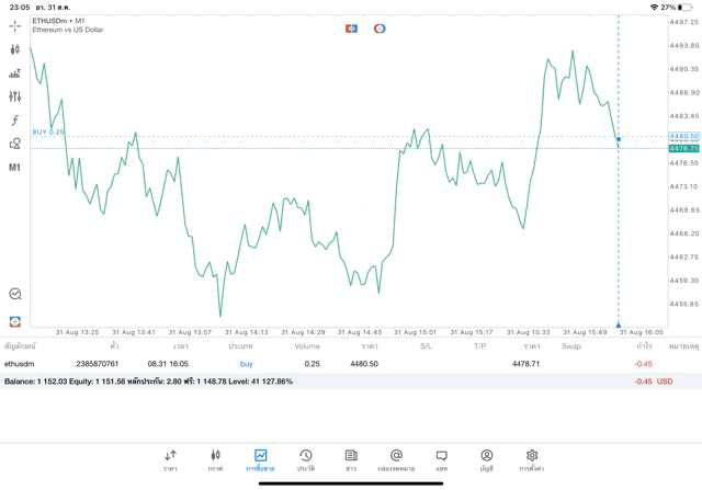 การเทรด Crypto ETHUSD 0.25 lot แอพ MT5
