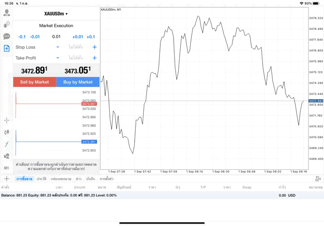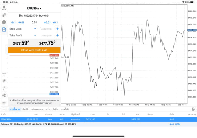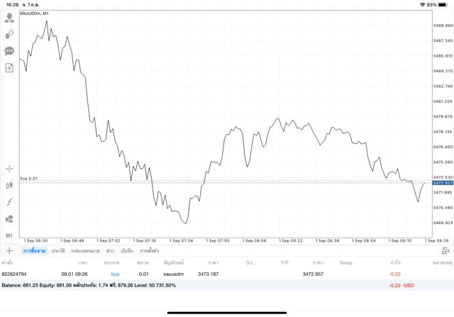 การเทรด XAUUSDm (ทองคำ) 0.01 lot แอพ Mt4