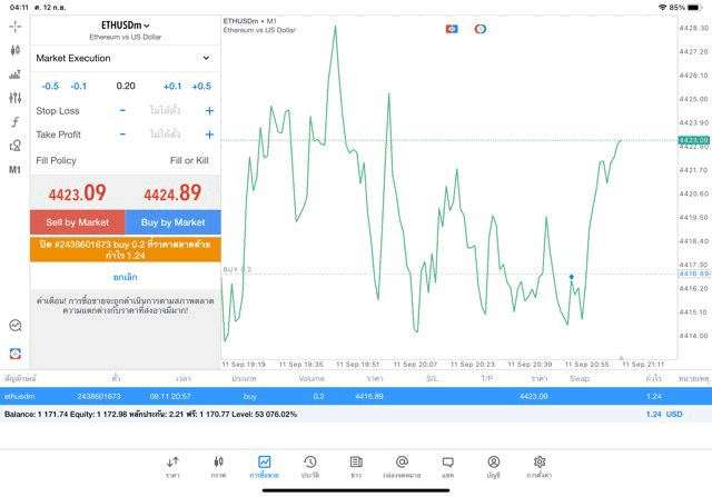 คลิ๊กค้างบน ETHUSD จากแผงรายชื่อหุ้นที่เพิ่มขึ้นบนหน้าแรก เลือก เปิดกราฟ ETHUSD แล้วคลิ๊กปุ่ม +สีน้ำเงินแดง บนแผงเมนูด้านข้าง เมื่อหน้าต่างส่งคำสั่งเทรดเปิดขึ้น กรอกจำนวน lot เช่น 0.2 ตามภาพด้านล่าง เลือกทำกำไร ETHUSD ได้ทั้งขาขึ้นหรือลง โดยเลือก คลิ๊กปุ่ม Buy by market หรือ Sell by market