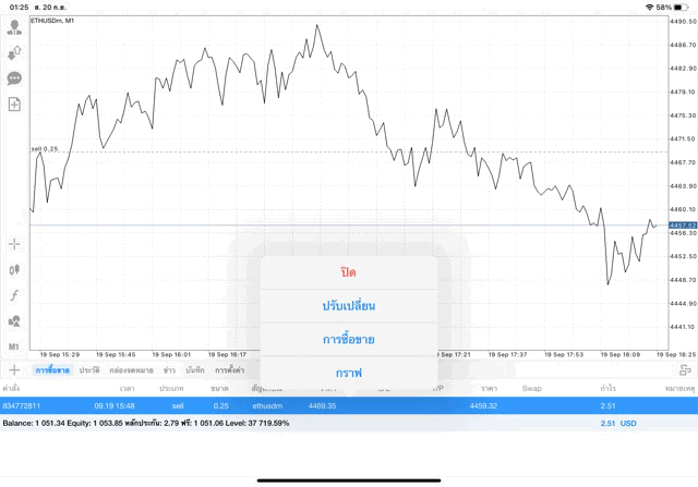 คลิ๊กค้างบน ETHUSD จากแผงรายชื่อหุ้นที่เพิ่มขึ้นบนหน้าแรก เลือก เปิดกราฟ ETHUSD แล้วคลิ๊กปุ่ม + บนแผงเมนูด้านข้าง เมื่อหน้าต่างส่งคำสั่งเทรดเปิดขึ้น