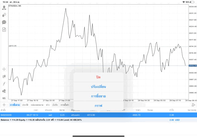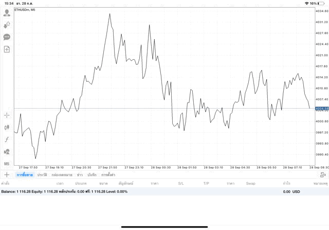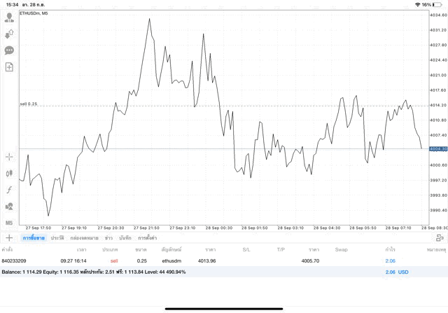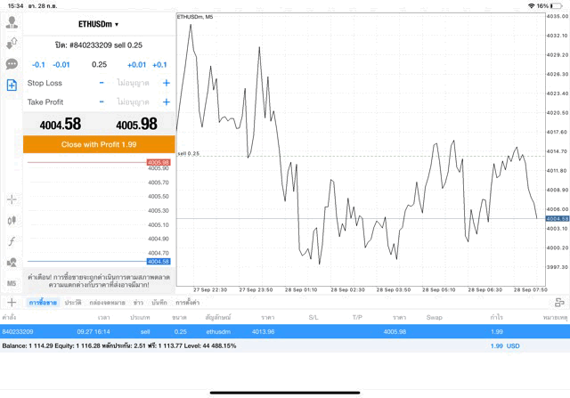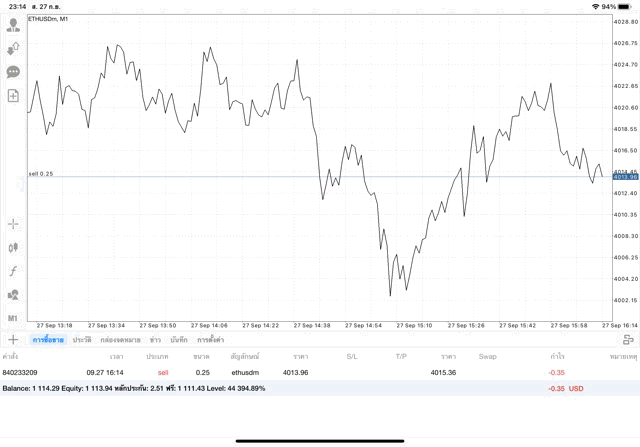 การเทรด Crypto ETHUSD 0.25 lot แอพ MT4