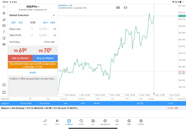 กรอกจำนวน lot เช่น 0.05 ลงในหน้าต่างส่งคำสั่งซื้อขาย เลือกทำกำไรได้ AUD แลกเปลี่ยน JPY ได้ทั้ง ขาขึ้นหรือ ลง โดยเลือก คลิ๊กปุ่ม Buy by market หรือ Sell by market