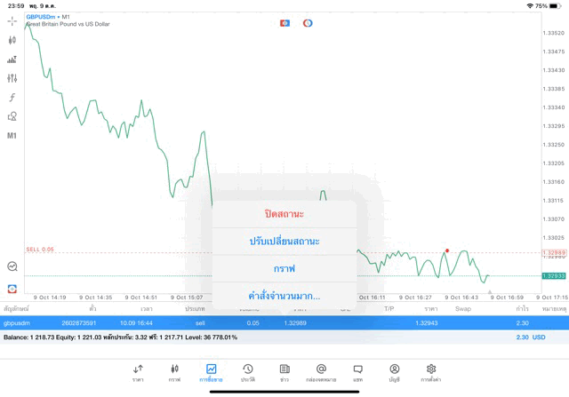 คลิ๊กค้างบน GBPUSDm ที่เพิ่มมาบนหน้าแรก แล้วเลือก กราฟ เปิดกราฟราคา GBPUSDm วิเคราะห์ราคา แล้วคลิ๊กปุ่ม + บนแผงเมนูด้านข้าง เปิดหน้าต่างส่งคำสั่งซื้อขาย